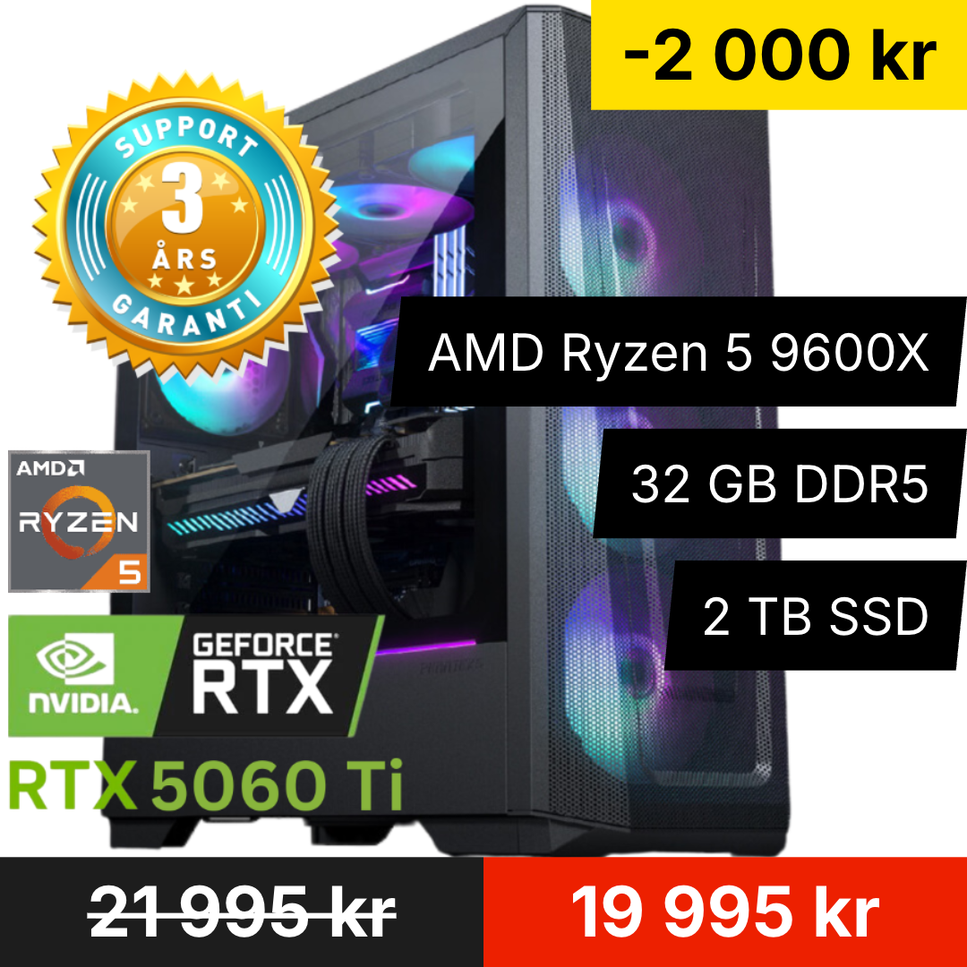| | | | En högpresterande gamingdator med Ryzen 5 9600X, RTX 5060 Ti, 32GB DDR5 och 2TB SSD – ett kompromisslöst kraftpaket för maxad FPS, tung multitasking och krävande kreativa projekt. |