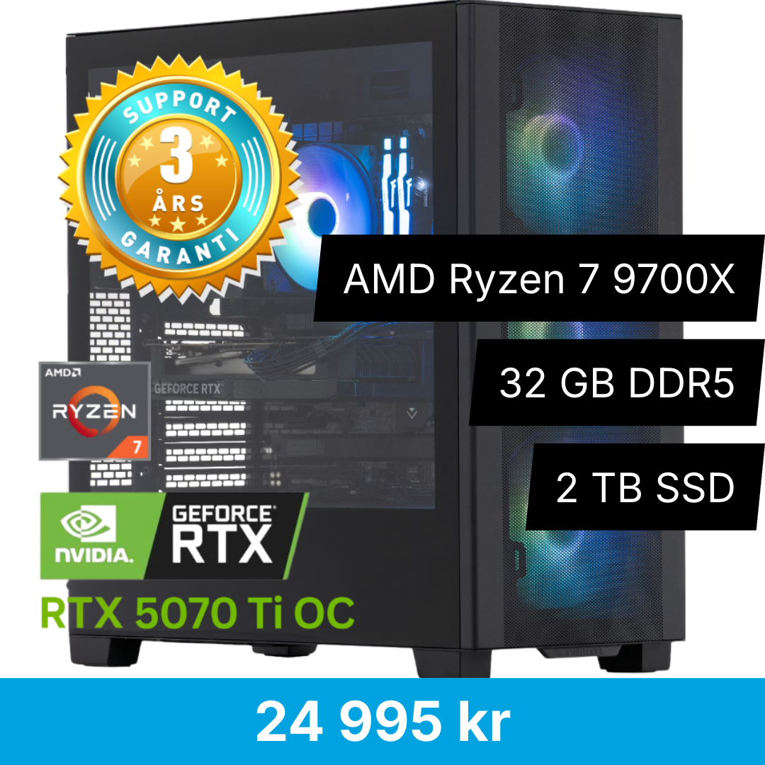 | | | En extremt kraftfull gamingdator med Ryzen 7 9700X, RTX 5070 Ti OC, 32GB DDR5 och 2TB SSD – ett kompromisslöst kraftpaket för 4K-gaming, streaming och krävande kreativa arbetsflöden. |